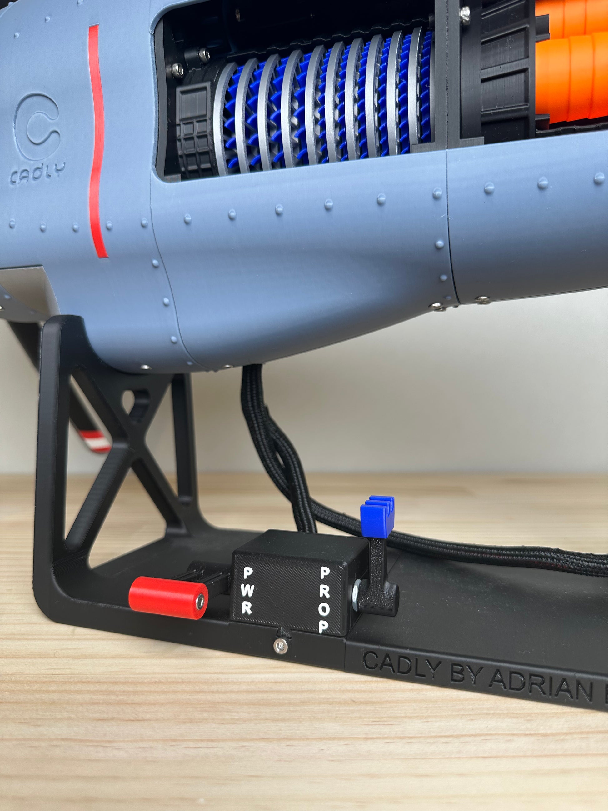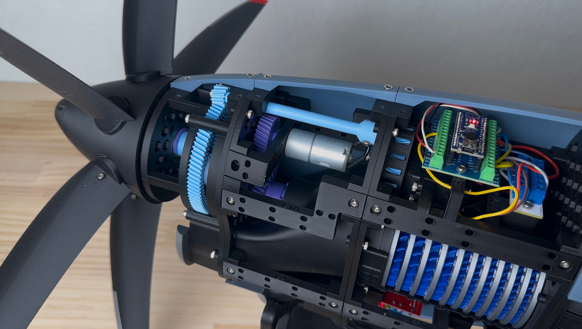A single MG996R/SG-5010 servo operates the variable pitch propellers with precision using the planetary gearbox second stage.